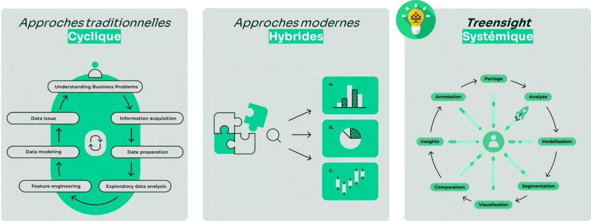 L’approche méthodologique sur laquelle se fonde Treensight Explorer se distingue radicalement des méthodes traditionnelles et modernes par son caractère systémique et intégré. Contrairement aux approches cycliques, où les étapes (collecte, préparation, modélisation, analyse) sont cloisonnées et répétitives, ou aux approches hybrides, qui juxtaposent des outils et des visualisations sans continuité, Treensight propose un écosystème unifié. Ici, toutes les phases — modélisation, segmentation, visualisation, comparaison, annotation et partage — s’articulent autour d’un noyau centralisé (l’utilisateur), permettant une analyse fluide, collaborative et itérative. Cette approche élimine les ruptures entre les étapes, favorise la traçabilité et la réactivité, et rend l’analyse de données plus intuitive et actionnable en temps réel. En plaçant l’utilisateur au cœur d’un processus dynamique et interconnecté, Treensight transforme la data science en un levier agile et accessible, adapté aux enjeux complexes des organisations modernes.
