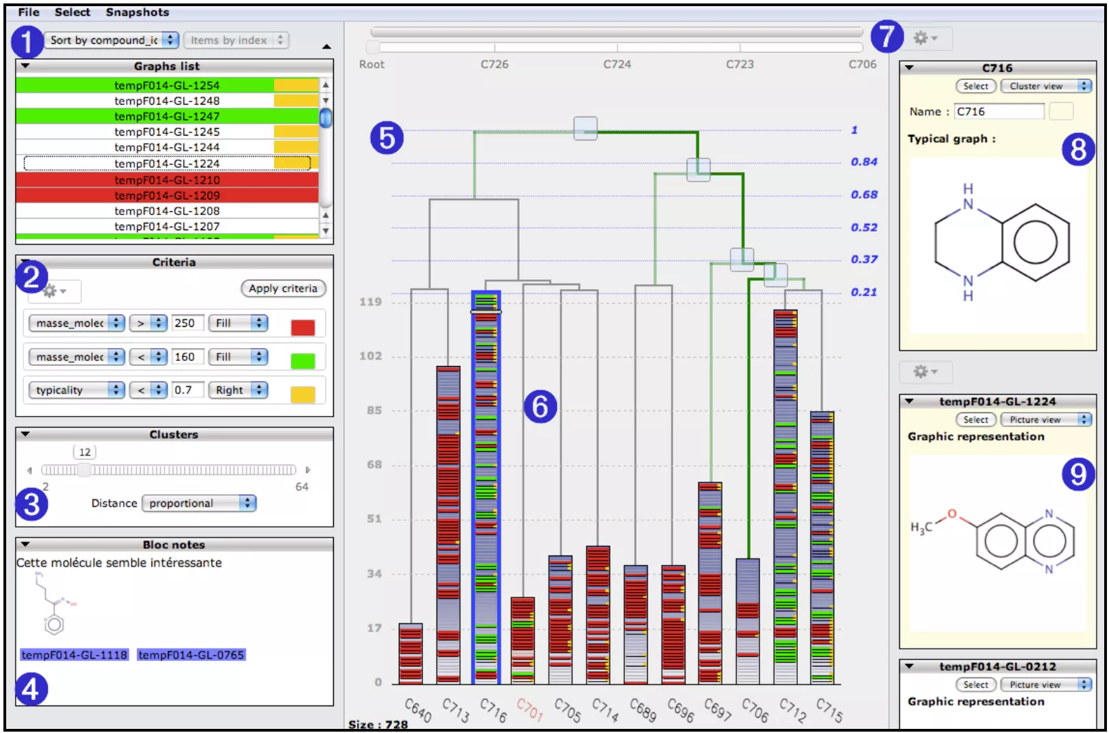 Nous avons développé (Aci et al. 2007 ; ) une mesure de similarité structurelle dans laquelle les molécules sont représentées comme des graphes (2D) et qui, couplée avec un algorithme de CAH utilisant un indice d’agrégation de Ward, permet d’effectuer des classifications chimiquement pertinentes pour des chimiothèques comportant quelques dizaines de milliers de composés. Toutefois, comme nous l’avons précisé l’intérêt de construire de telles classifications dépend entièrement de la possibilité qu’ont les chimistes de les analyser et donc de les explorer visuellement de manière la plus interactive possible. Notamment, il est intéressant de savoir :