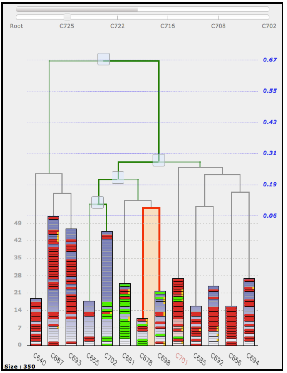 Figure 3 : Visualisation du chemin courant dans la hiérarchie entre la racine les feuilles en cours d’exploration. Lorsque l’on augmente/diminue le nombre de classes visibles (« ) le sous-arbre qui va être modifié est visualisé : ici la diminution du nombre de classes conduira à la fusion des piles C678 et C698.