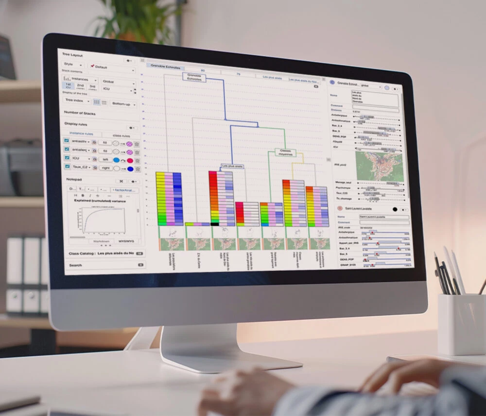 Treensight Explorer permet à l’utilisateur de mieux comprendre l’organisation de ses données et d’en dégager des structures lisibles, là où une table classique se limite à une juxtaposition de lignes et de colonnes. Il peut explorer ses données sous différents angles, comparer des populations, faire ressortir les variables les plus structurantes et repérer des cas atypiques.